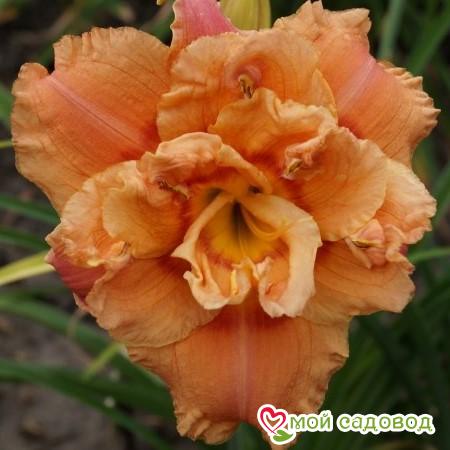 Потрясающий махровый сорт достигает в высоту 65 – 70 см. Он отличается ранним сроком цветения. Цветки формируются густо-махровые, окрашенные в персиково-лососевый цвет с легким розовым оттенком. По краям они сильногофрированные, с широкой желтой окантовкой. В полном роспуске их диаметр равен 14 см. Листья длинные, ярко-зеленые, гладкие. Период цветения приходится на июнь-август. Аромат тонкий и ненавязчивый.